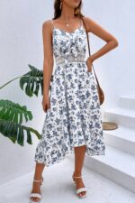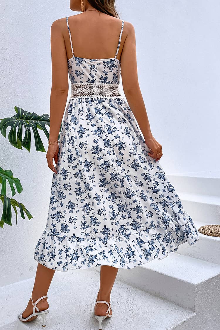 L’empiècement en dentelle délicate sur le haut de la robe ajoute une touche de sophistication, tandis que la jupe fluide en mousseline permet un mouvement naturel et une certaine légèreté. Les détails subtils de la robe, tels que les manches bouffantes et le nœud à la taille, renforcent l’esprit bohème et champêtre.