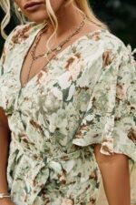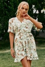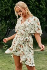 La coupe courte en cache-cœur souligne le buste avec élégance, tout en offrant un décolleté flatteur. L’ourlet de la robe est suffisamment long pour être élégant tout en évitant de traîner sur le sol. Cette tenue d’invitée de mariage est disponible dans différentes tailles pour s’adapter à toutes les morphologies.